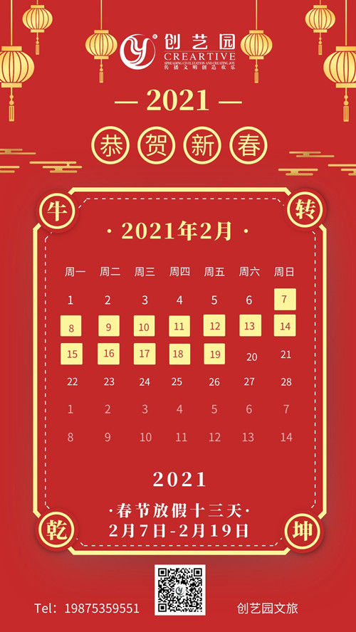 深圳市创艺园文旅集团总部放假时间为:2021年2月7日(农历腊月二十七)至2021年2月19日(农历大年初八),共13天。2021年2月20日正式上班(农历大年初九)。创艺园梅州分部、成都分部放假时间由各分部根据工作实际情况自行安排。