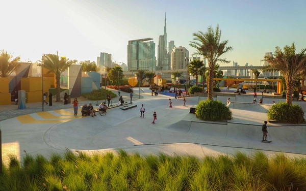 迪拜海滨运动公园的设计中以创新性的思维将运河修筑工程中遗留的混凝土块进行了重新利用,并将此打造成独特的景观。为此,迪拜海滨运动公园还被称为“混凝土块”公园。