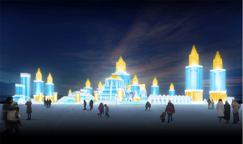 2)冰雕与雪雕:通过对冰雪材料的表面处理、体块堆砌、刀痕刻迹,将冰雪材料特有的质感创作,冰雕通常有透雕、圆雕、浮雕三种形式,通过切、旋、削、刻、铲、镂等方式创造出形态多样的景观;