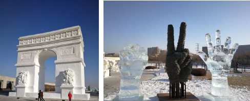 在展现冰雪主题主景上我们可以用直接写实、抽象联想、借景抒情、夸张烘托的设计方法。直接写实设计方法一般通过文字或图案雕刻等传递文化内涵,游客能直接的了解设计者所传达的意图,这种设计方法可以准确突出场地特征的优点。这方面的应用有冰雪诗词和冰雪典故雕刻等;抽象联想通过氛围的营造带动游客的情绪,当游客在特定的空间时,能与场地的文化特征产生共鸣。这种设计方法比较抽象,但是能明确传达场地文化内涵与价值;借景抒情又称寓情于景,在冰雪主题公园的规划设计中,可以通过对景物的细致观察和感受,再通过主景的形象进行情感的抒发,特点是“景中有情、情中有景、情景交融”,以美好的情感烘托主题,达到某种意境。这种设计方法会要求设计者对所要抒发的情感有足够深刻的体会,为抒情去设计景观;夸张烘托设计方法是指设计者根据主景特点的需要,对主景的某一特点进行放大或是缩小的处理,通过景点设计时的尺度、质感、体量上的对比,与游客固有的感知形成强烈反差,从而诠释出景点的内涵。这种设计方法不是为了制造某种噱头而进行无目的的放大,而是在尊重客观事实的基础上,从设计师对项目整体把控的基础上,在需要进行特殊处理的景点上,以独特的视角抓住设计对象中的某一点,为了给游客带来视觉上的冲击感,对景点的设计留下深刻的印象,再经过设计语言上的提炼,达到夸张烘托又不违和的效果。