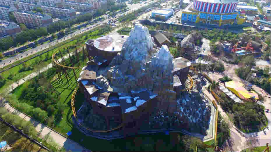 雪山矿山车位于哈尔滨万达主题乐园林海雪原区,矿山车动感平台共包含两个场景,分别包含了转向换轨和倒滑换轨平台,根据设备换轨的不同体验,分别设计了惊天大地动、火山大熔岩、动物大逃亡、黑熊大咆哮四个不同体验。