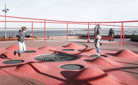 无动力乐园的儿童游乐设施设计非常独特,设计者运用极简概括的方式创造了多功能的无动力游乐设施。其中一个无动力设施位于乐园场地居中的位置,从空中俯视的角度观察它的外形,仅仅是由一个圆环和三条铁链相组合构建而成,但这个看起来非常简单的无动力乐园设施却可以满足儿童停座、攀爬等多种需求;另外一个造型的设施,是像圣诞树一样的塔状形状,在不断攀升的铁环上设计者还设计了内置的螺旋形的网道,这些网道可以让孩子们沿着网道向上爬升至圣诞树铁环的顶端,俯瞰眺望整个城市的风景;还有一个蹦床的设计,创新的将蹦床进行分散分布,但又同时组合,并以圆形作为统一的设计语言,在该处中央设置一个较大的圆形中央蹦床,外边围绕着几个较小的圆形蹦床,蹦床之间还分布着一些凸起的小山丘,让这里的蹦床地形更加丰富多元。这些创新的无动力游乐设施在很大程度上吸引了儿童的注意力,同时创新的造型设计也加分不少,让无动力乐园更为美观。