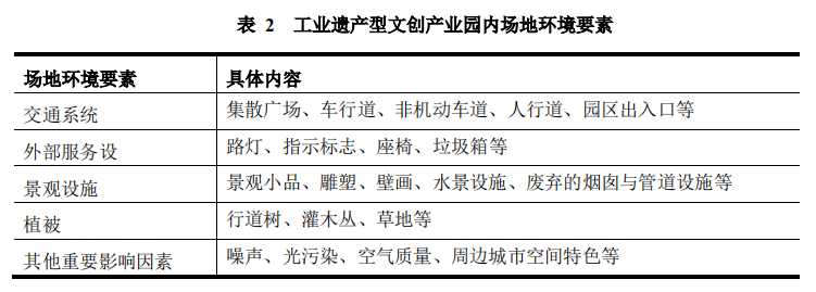 随着时代的变迁,建筑师在进行建筑设计时关注的主题和表达的内容都有着极大的不同,但是有一点从未改变,那就是建筑需要适应场地环境。所在工业遗产型文创产业园的改造提升中,除了对旧工业建筑的情况进行充分的了解掌握外,还要对建筑所依存的载体——场地进行详细的调查。场地环境的调查首先要理清场地环境都包含哪些要素。通过整理前人的文献我们可以基本确定在文创产业园中的场地环境要素包括交通系统要素、外部服务设施、植被、景观设施以及噪声、光污染情况、空气质量等外部因素等(表2所示)。