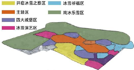 冰雪主题公园内规划设计了滑梯城堡、迷宫城堡、单车城堡、生肖城堡等四大主题城堡区。其中生肖城堡设计上采用了哥特式风格,城堡内规划有十二生肖冰雕景观,中心设计有喷泉,在零下 40 度也不会结冰,这象征着爱情的永恒,是游客表白求婚的最佳场所;单车城堡设计上以冰上自行车互动项目为主题,为游客提供亲子互动的冰上自行车活动;滑梯城堡有多条不同动线的趣味冰滑梯组成,游客可以乘坐冰滑梯在城堡中穿梭,方便游客进行冰雪体验。
