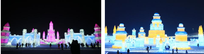 园区的入口景观在“开启冰雪之旅区”通过大体量冰块砌筑观景墙,并有“哈尔滨冰雪大世界”的字样展示,有集散作用。规划设计的冰雪大世界主题乐园形象大门——“冰城之约”景观作为迎宾景观,其设计灵感来源于丝绸与长城的相互交融,象征着哈尔滨冰雪大世界主题乐园在过去 20 年的冰雪历程和冰雪文化的发展与传承,彰显了园区整体形象;“永恒冰琴”景观采用冰雕方式将琴键设计成与游客互动的设施,游客踩踏位置与力度的不同,发出的琴声也不同,并可自动调节光源的强弱与颜色。
