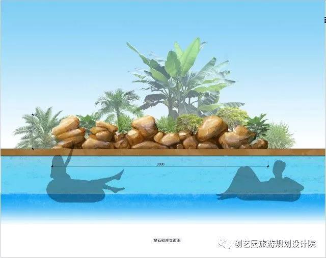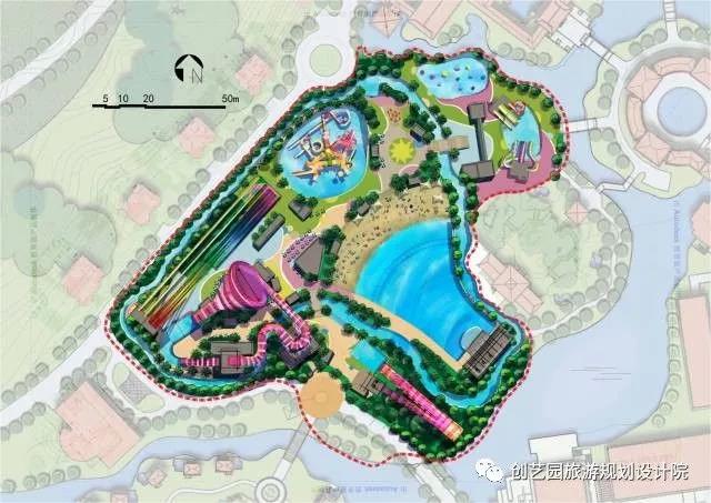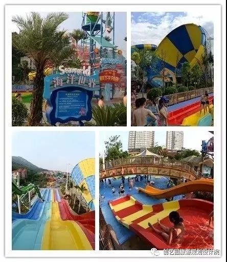 阳光海岸重在使游客在欢乐的水世界里感受阳光、沙滩、海浪的惬意,故设计师在做规划设计时提出了漂流码头、阳光沙滩、奇幻漂流、旱地攀岩、欢乐喷泉、海洋世界、巨浪湾、海浪剧场、餐饮中心等内容。