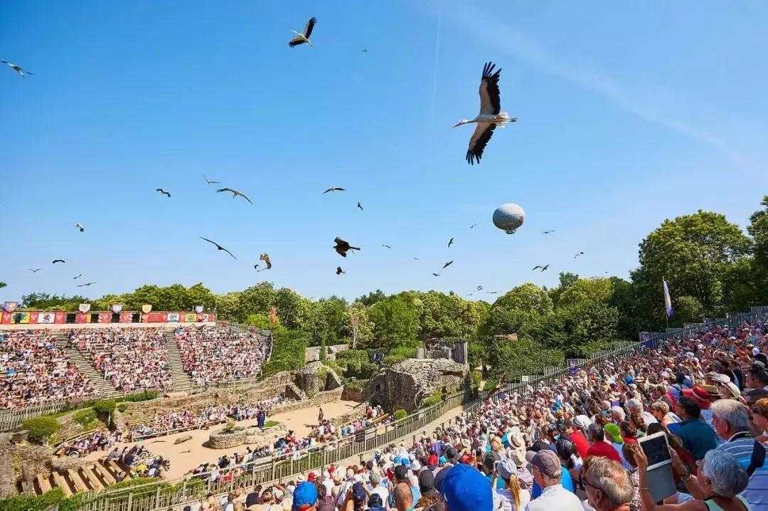 在中世纪城堡遗址里举行的飞禽表演“幽灵鸟舞会如同一场空中芭蕾舞,训练员用口哨引导200多只猎鹰、雕、猫头鹰等飞禽盘旋,叼食,在观众肩膀上驻足,与观众近距离接触互动,加强观众的体验感,使得整个表演在空间上的完成度极高。