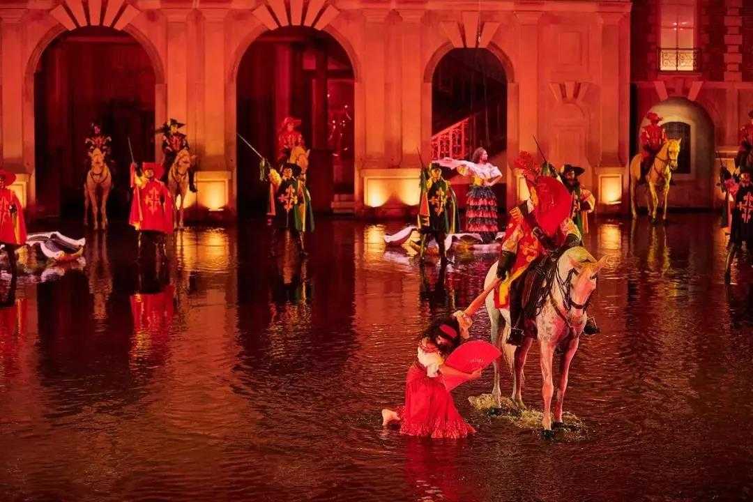 这个舞台设计充分展现了法国人独特的审美,他们追求的往往不是奢华庞大,表演中舞池突然间变成浅浅的水池,群马踏起水花,此时配上色彩瑰丽的灯光,一切都是完美的配合!值得称道的是舞蹈、剑术、马术表演上的融合度,其精湛程度毫不逊色于大型的舞蹈赛事现场。
