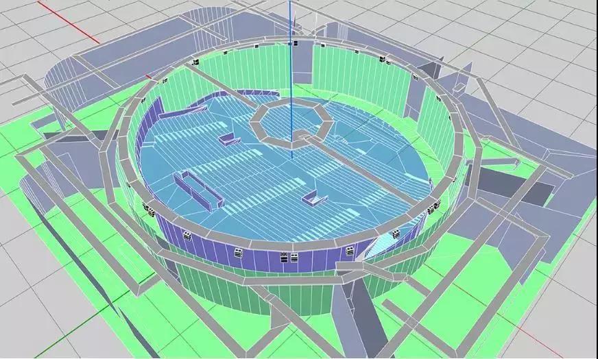 整个观众台是建立在一个可以旋转的底座上,周围是360度环形舞台,根据剧情被分成若干个布景。