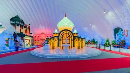 室内冰雪景区,是在室内观赏冰景的游览区,冰面够图上,此处作为私家园林构图特点中的前庭后院中的院,又许多的小型建筑组成,建筑风格同样仍采用欧式风格,但在道路设计上也是曲径通幽,蜿蜒曲折,使有限的空间无限扩大,室内有可长期保存的冰雪景观,不仅在冬季可以观看,其他季节也可以保存。这也缓和了北方的冰雪文化只能在冬季体现的遗憾。
