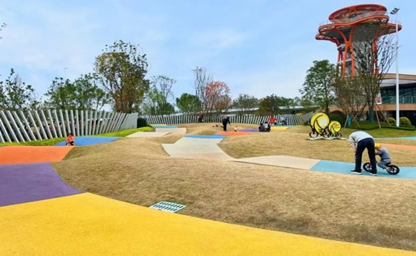 城市公园中也会有很多不同的功能分区,不同的功能分区通过各类公园中的园路或者廊道等相连产生关联。在这些道路铺设中以艺术化的设计手法进行创新,形成让人耳目一新的地面景观,为路面增添活跃的氛围,让脚下的每一步都是风景,提高步行的体验。如今,许多城市公园铺装设计中大量使用橙、黄、蓝等明亮色系,营造公园的欢快氛围。例如,由创艺园投资运营打造的嘉印拾光城市公园设计中就大胆使用了粉红、蓝、黄、橙等色彩,让整个公园呈现出青春、欢快的氛围。此外,创艺园建议设计师还可以将铺装与植物、建筑、水体结合起来进行搭配设计,让周围的环境即统一又和谐,主色与辅调相得益彰,在铺装材料的选取上及铺装的形状组合上也可以进行不同的尝试,让脚下的路灵动起来。