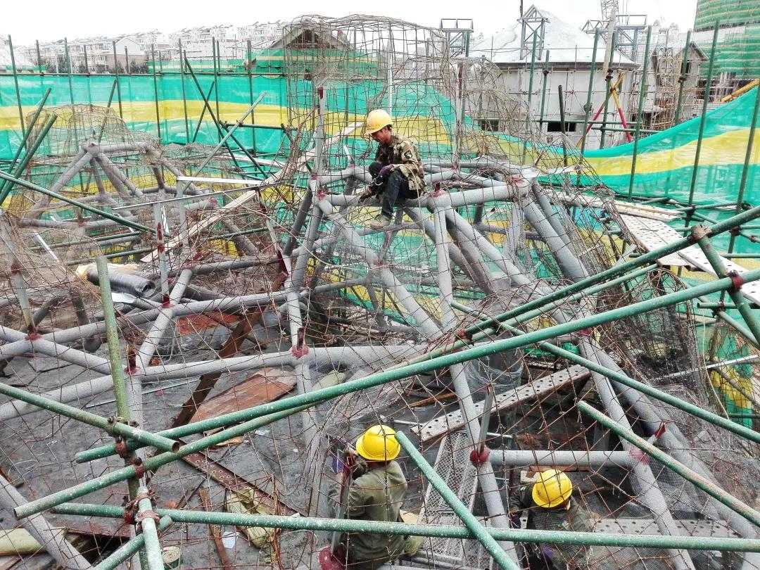 在脚手架搭设完成后,我司项目部组织脚手架配合单位、监理单位、业主单位、设计单位、外包装施工班组负责人共同对脚手架的搭设完成情况进行验收,主要检查整个脚手架架体结构是否有问题、每层架体的侧面及底部防护是否符合规范要求、对其他设备的保护措施是否安装完成、搭设的架体是否满足大雪山造型施工的需求等各方面进行验收,对于不符合规范的地方,坚决整改,不留后患。