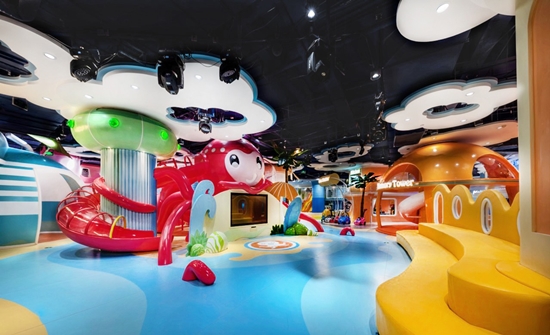 另一个是听觉上的互动设计,宝贝王儿童乐园中星广场是整个儿童乐园的中心,以章鱼为主题的滑梯组成舞台营造出海边的度假场景。在舞台安装了灯管与音响系统,为现场营造出充满活力的氛围,孩子们可以在动感的声响与科幻的光影中体验,还可以在舞台之中充分展现独特的自己。