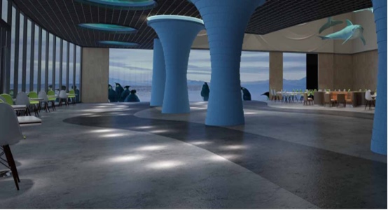 作为重要区域的展示区,承担着展示、科普、教育等作用。在此处中心位置放置了LED 屏幕,利用高科技向游客展示,并将该区域分为左右两边,左边为标本区域,右边为实物区域。用格栅制作的吊顶中间设计成一个湖面的曲线,模拟制成缩小版的湖水。另外展示区还用玻璃罩隔绝游客触碰到展示品,并且在周围使用了不规则的曲线设计。展示区的设计充分传递了科普的理念,号召群众提高环境保护意识,体现了生态的设计理念。连接餐饮与展示区的廊道设计也充分突出了海洋的主题,例如墙面 LED 仿真技术的电子屏其线条的流线型吸取了海洋生物中的鱼类的游动的过程中留下的痕迹,以渐变的灯带曲线来引导游客,铺装以波纹型设计来营造海洋的主题效果。