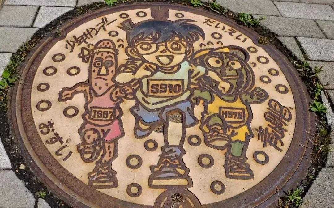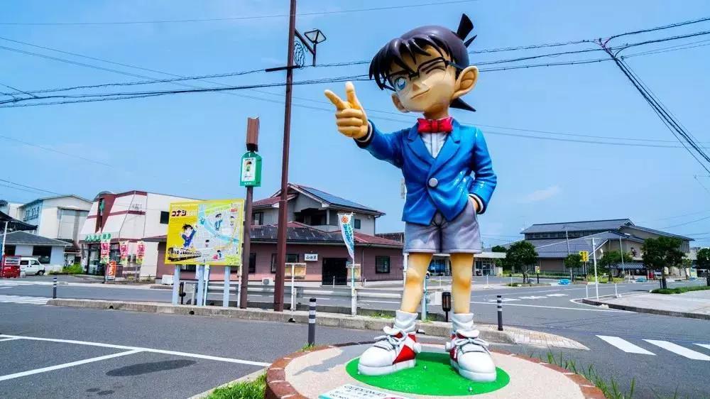 路上的标志牌、浮雕、铜像、井盖全以柯南为主题;“柯南大桥”上更是三步一像、五步一雕,连图书馆和小学门口都有活灵活现的柯南铜像。