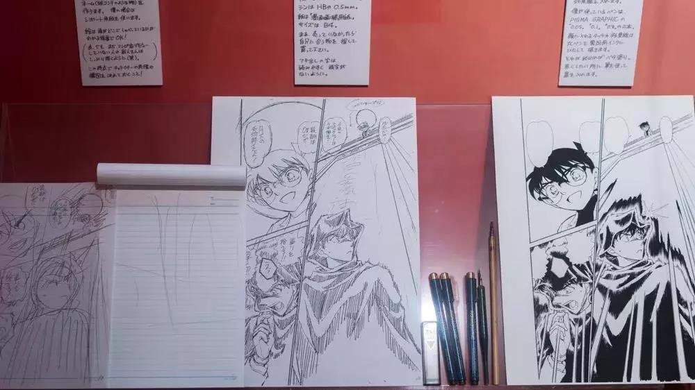 入馆后往右就是接待处,付好门票钱就能入馆,馆内有青山刚昌老师漫画梦想的少年时代文集,以及青山作品的原画约100件等展品,如《怪盗基德》、《勇剑传说YAIBA》等,还有在《名侦探柯南》登场的新发明的体验角。