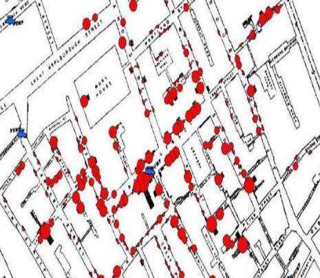 1854年伦敦爆发严重霍乱,当时流行的观点是,霍乱或者黑死病是由人口、或者“坏空气”等有害形式传播的。而John Snow医生研究发现,霍乱是通过饮用水传播的。研究过程中,John Snow医生统计每户病亡人数,每死亡一人标注一条横线。令人惊讶的是,大多数病例的住所都围绕在Broad Street水泵附近,无疑水泵可能成为霍乱的罪魁祸首。于是John Snow医生建议移除Broad Street水泵的把手,至此霍乱最终得以控制。