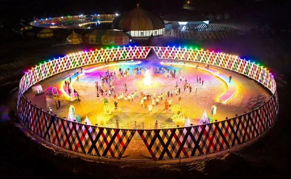度假区内一些特色的民俗文化活动充分展现了民族特色和地域文化特性。热烈的场面、悠扬的歌舞无不体现出当地的人情风俗与性格特征。鄂尔多斯婚礼舞台剧表达了鄂尔多斯蒙古族人民对美好生活的热情追求和粗犷、豪爽与善良的性格。夜晚的篝火蒙古舞会更是让游客感受到内蒙人民的热情和生活艺术。