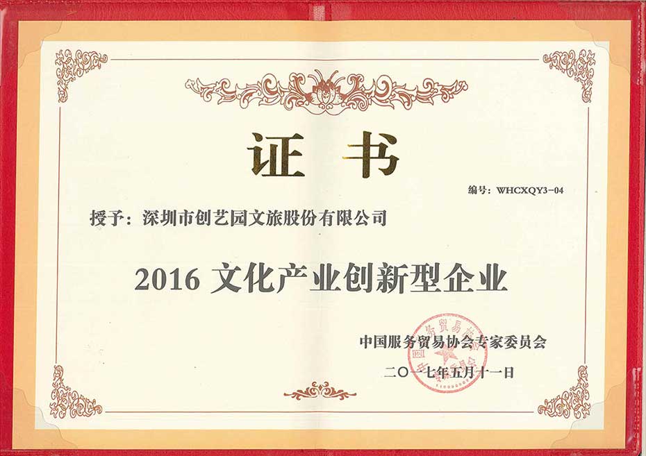 “2017年5月11日,由中华人民共和国文化部、中华人民共和国商务部、国家新闻出版广电总局、中国国际贸易促进会、广东省人民政府和深圳市人民政府主办的第十三届中国(深圳)国际文化产业博览交易会盛大开幕。在 “第十三届中国(深圳)国际文化产业博览会“暨 “第六届中国文化贸易与文化双创大会”上,深圳市创艺园文旅股份有限公司喜获“2016年文化产业创新型企业” 荣誉。”