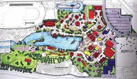 虽然功能方面对于运营成功至关重要,但新主题乐园也需要在视觉上吸引人,并且对于参与项目的非专业人员也是可以理解的。 展示新主题乐园的有效方式是通过空中视角,通常从“鸟瞰”的角度来看。 下面的空中透视图与上图所示的主图是相同的主题乐园,但是这个视角可以更好地了解主题乐园的样子,因为它在观众眼中更加清晰。