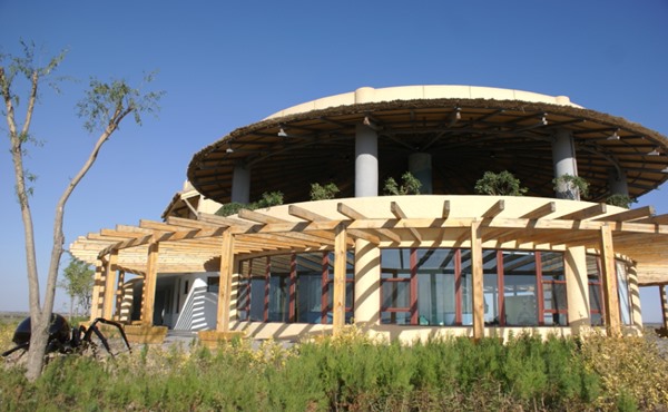 在景观设施上,设计者提取了沙漠文化、湿地文化、神话传说、边塞文化等。材料的选取大多就地取材,体现出当地的地域特色。沙湖旅游度假区中的建筑设计风格多元,体现不同的景观空间的设计主题,文化元素的应用通过建筑载体结合场地内本土材料设计,以抽象表达、具象引用、简化设计等方法呈现。如湿地博物馆,图区了沙丘、鸟巢、飞鸟等元素,以抽象设计的手法让建筑整体造型如一只展翅欲飞的鸟,大厅以鸟巢为视觉元素,周围以沙丘为主造型进行围合。生态度假酒店提取鸟巢、鸟蛋的元素,将客房打造为椭圆形的蛋壳造型,让岛屿整体造型成为一个完整的鸟巢。毛主席像章纪念馆的建筑顶部以芦苇搭建,建筑墙 体为土黄色,整体设计风格复古自然。售卖亭的造型则设计成鱼篓造型,并且错落有致。卫生间设计成为圆弧型,中间区域是水景景观,以芦苇与形态各异的陶罐小品组合打造空间氛围。