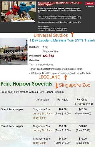 之前,乐天乐园和爱宝乐园度假村出售5件门票,只允许顾客乘坐5种车票。新加坡环球影城(Universal Studio Singapore)提供包含芝麻街(Sesame Street)特色早餐和门票的套餐,成人价格为113新币。马来西亚乐高乐园有一个包括往返巴士和门票的套餐。新加坡动物园为客户提供Park Hopper特价商品。客户可以选择3合1或2合1套餐,客户可以在购票后30天内访问两到三个乐园。